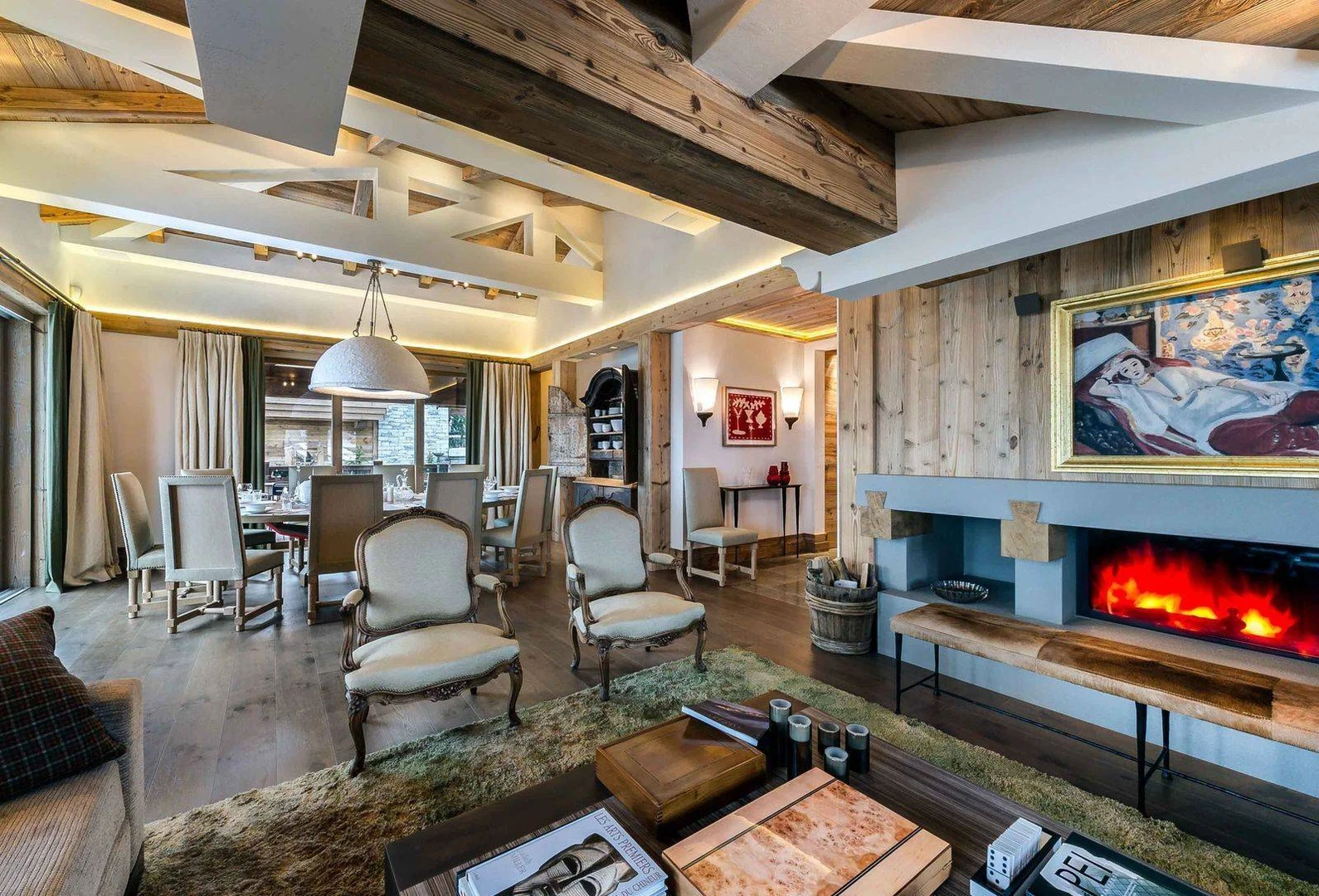 Designed by renowned interior designer Christophe Tollemer, the chalet embodies the essence of French art de vivre, blending authentic materials like old wood and natural stone with elegant furnishings, such as Louis XV armchairs. The interiors radiate warmth and sophistication, from the inviting lounge and elegant swimming pool area to the intricate staircase adorned with decorative metal foliage.
