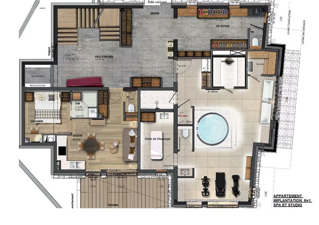 The third level houses the main living area with a spacious lounge, dining room, fully equipped kitchen, home cinema, and billiards room, all designed for comfort and conviviality. After days on the slopes, guests can relax in the dedicated leisure area featuring an indoor jacuzzi, sauna, gym, and massage table. To enhance the stay, the chalet provides the services of a housekeeper, private chef, and chalet manager.