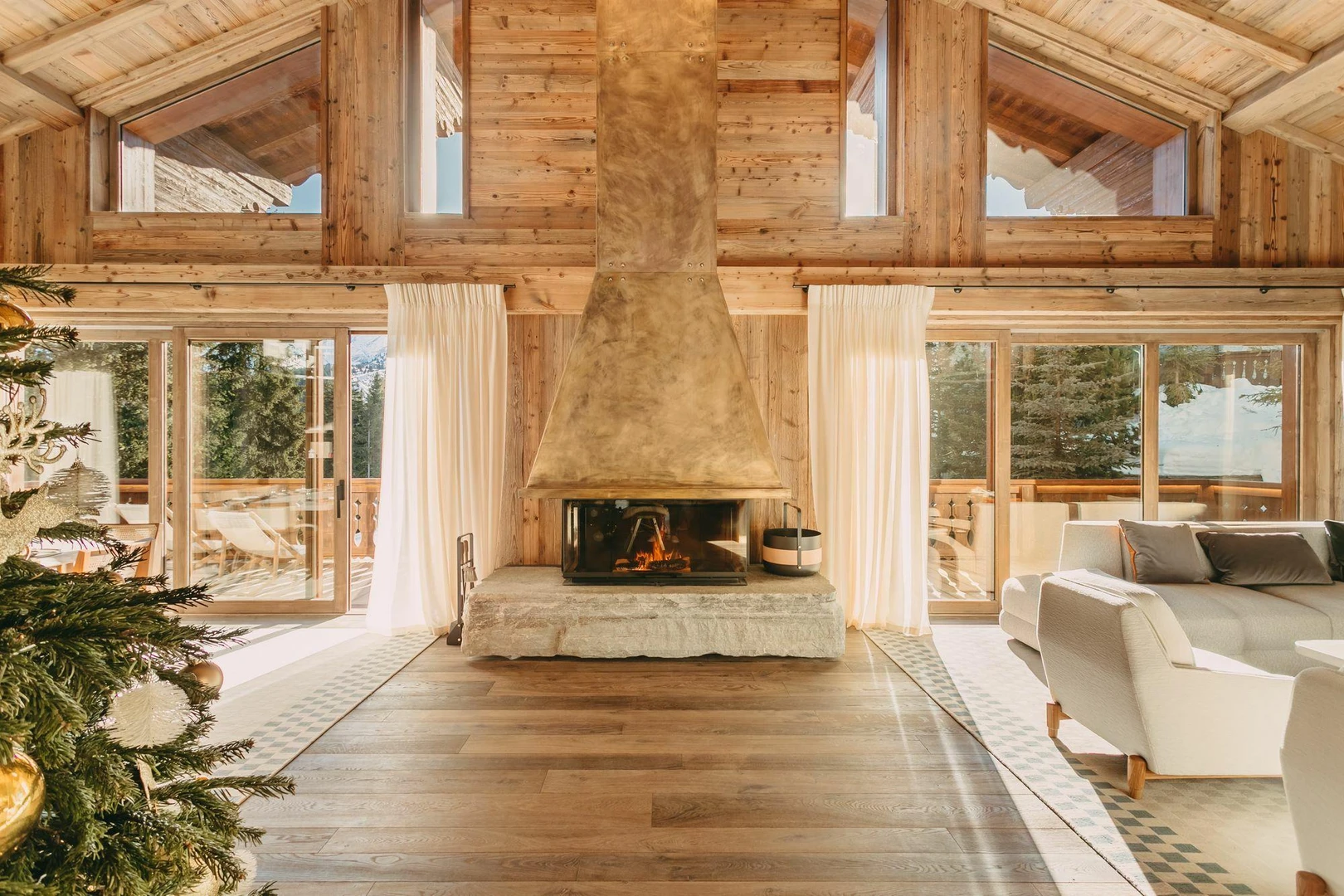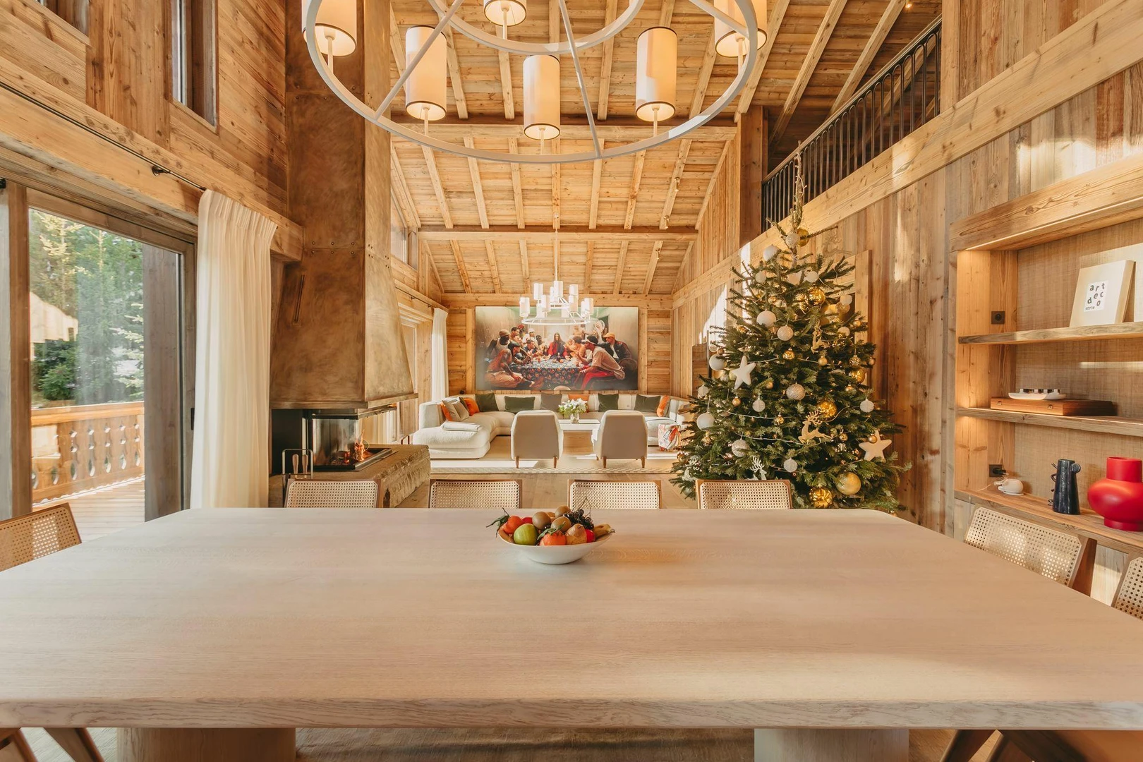 Spread across five levels, the chalet features 6 elegant en-suite bedrooms and a spacious living area with soaring ceilings and a striking central fireplace. The room opens onto a vast south-facing terrace with panoramic views of the Courchevel slopes and snow-capped peaks. A mezzanine with a private balcony overlooking the living room serves as a peaceful and comfortable workspace perfect for guests mixing leisure with business.
