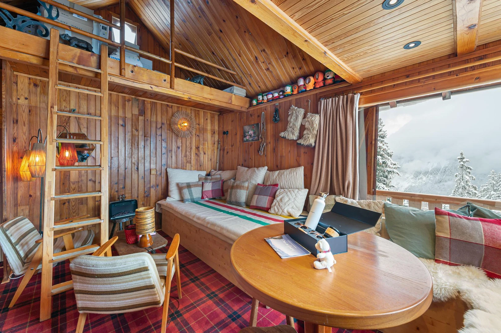 Designed in a cozy alpine refuge style with vibrant touches, the 64 sqm space is perfect for up to four guests. It features two comfortable double bedrooms, a fully equipped kitchen, a dining area, and a living room with stunning panoramic views of the valley and snow-capped peaks.