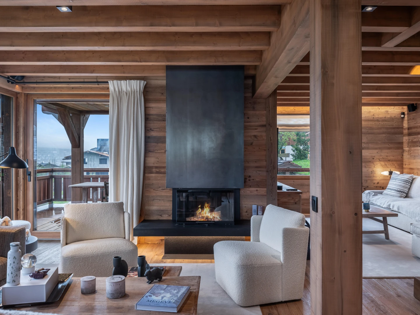 The chalet features five double bedrooms, each with its own en-suite bathroom, and a bright, open-plan living area that includes a lounge, TV corner, dining space, and a fully equipped kitchen arranged around a contemporary fireplace. Natural light floods the interiors, while a palette of earthy tones, sleek lines, and dark wood finishes creates a warm and calming atmosphere.