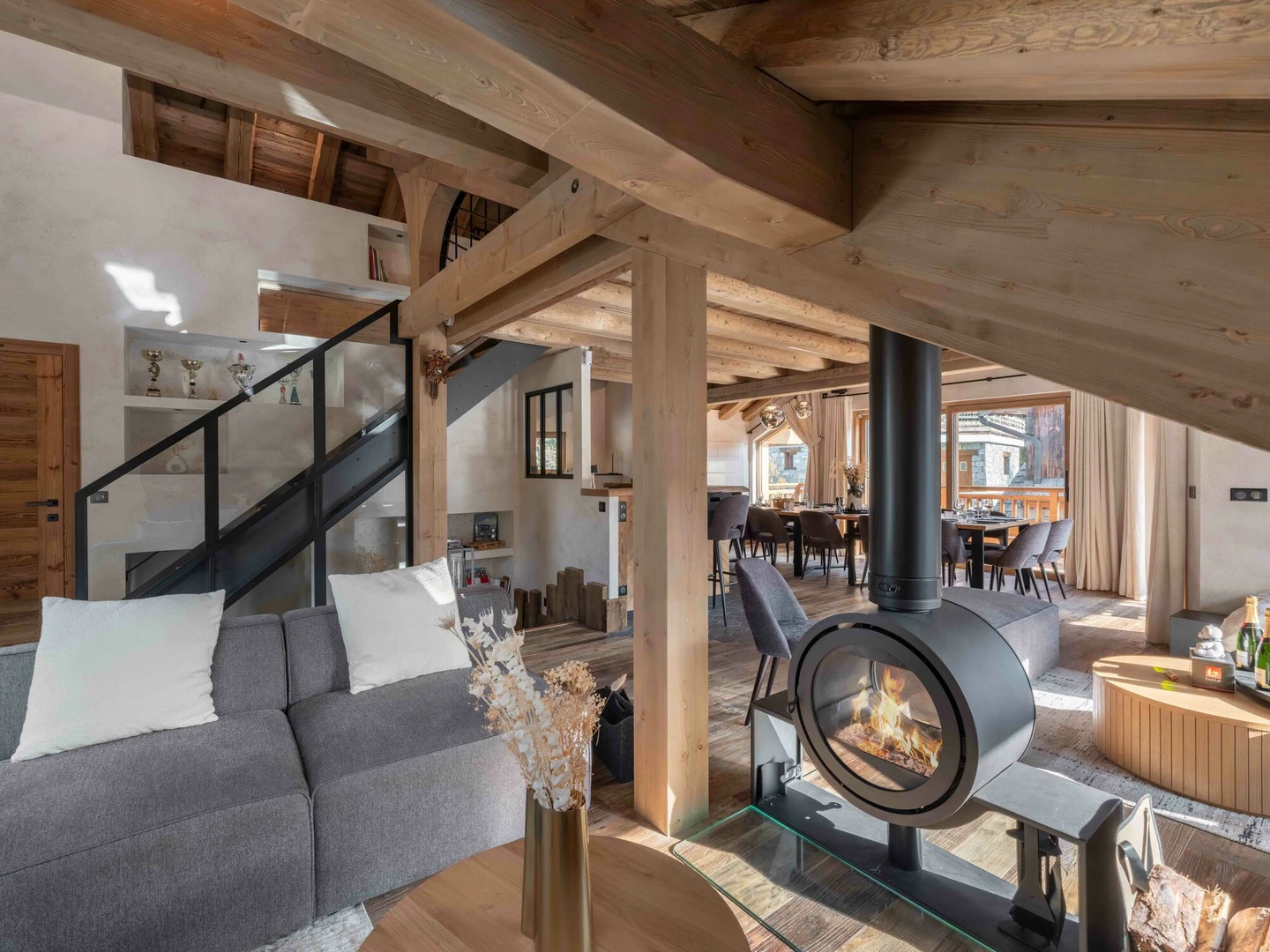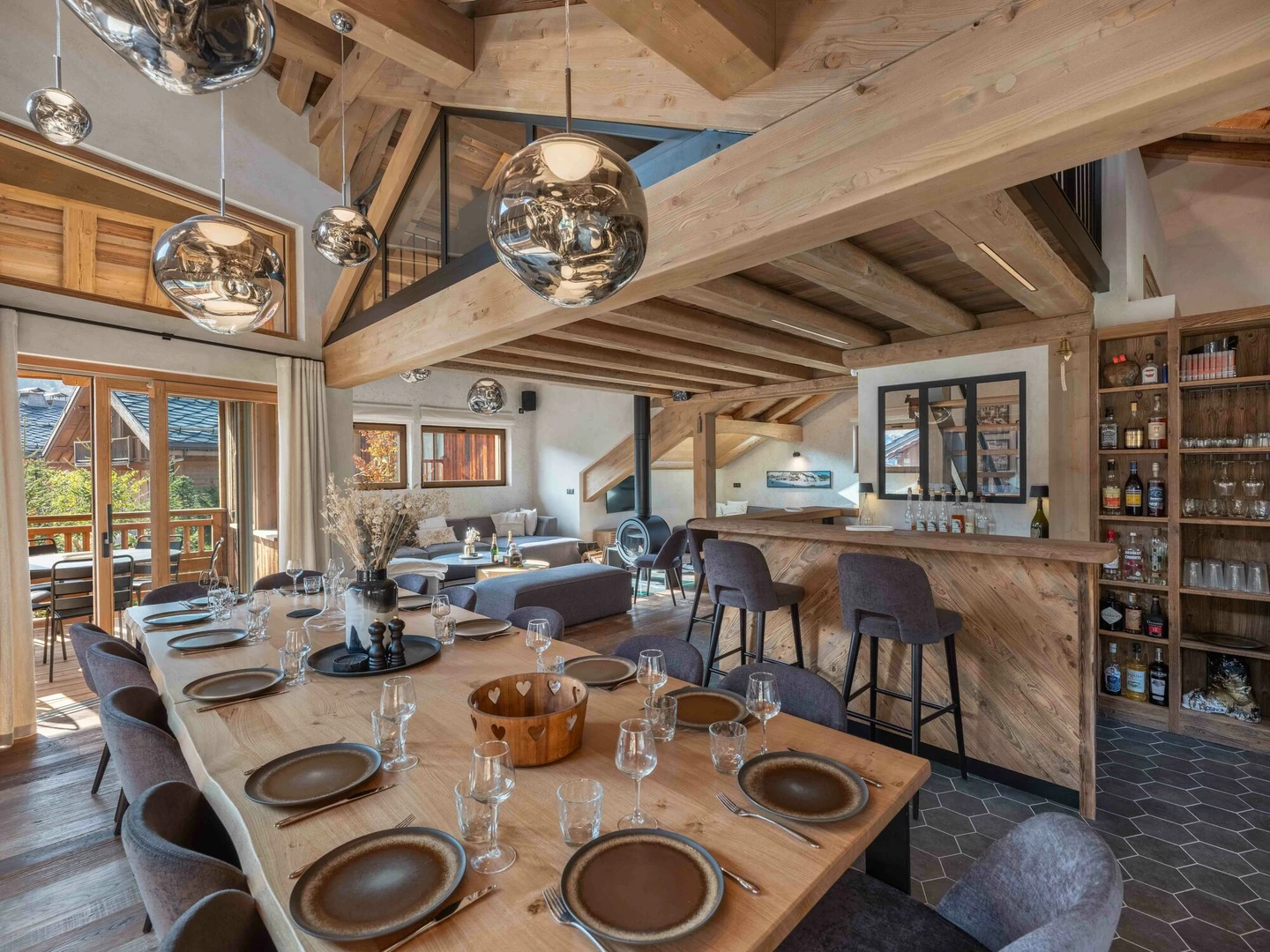 The heart of the chalet boasts two inviting lounges with a central fireplace, creating a warm and welcoming ambiance for relaxed evenings. A large, well-equipped kitchen opens onto a spacious dining area, where 14 guests can comfortably share meals. A bar and expansive terrace complete the space, ensuring unforgettable après-ski moments.