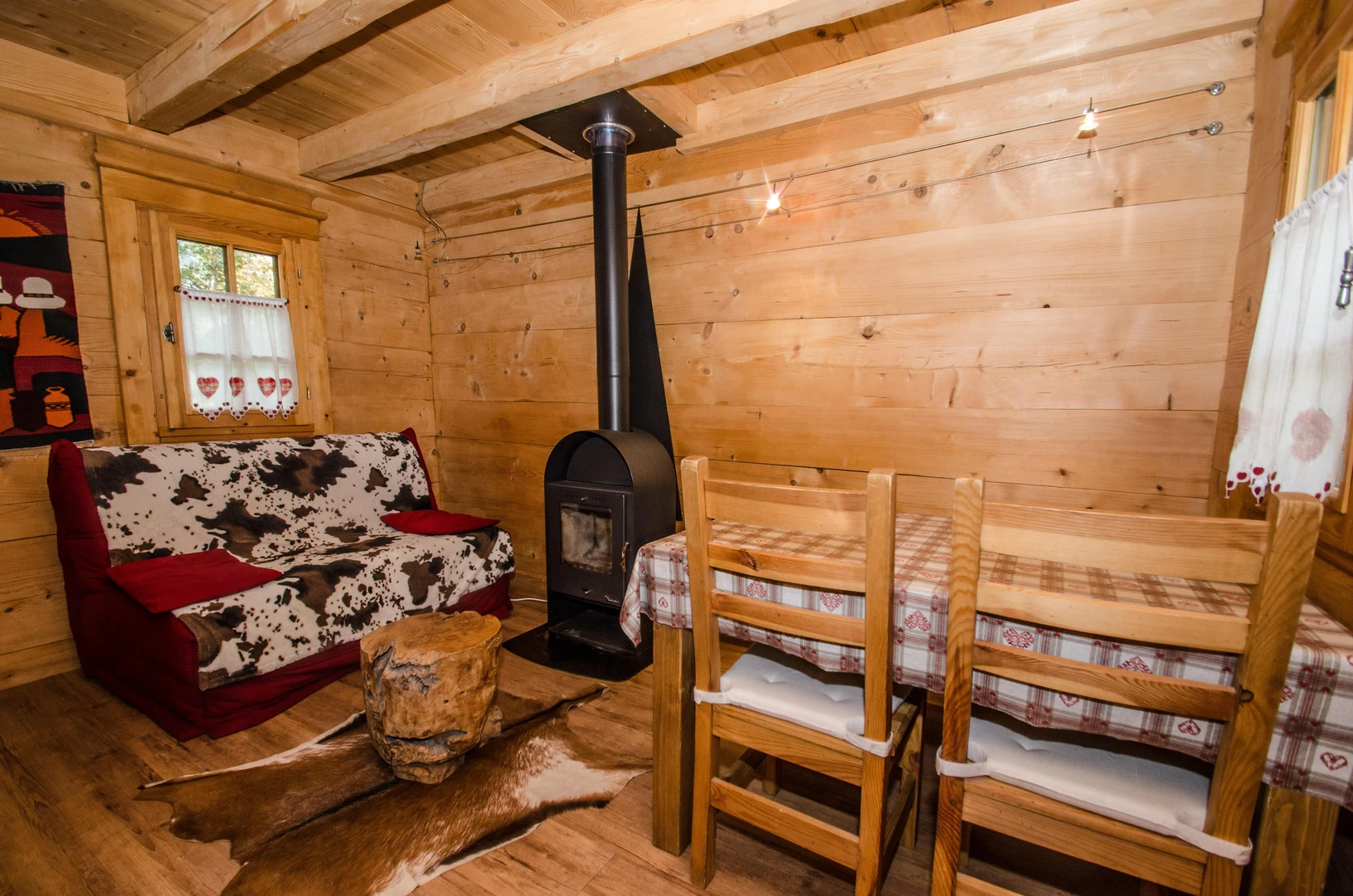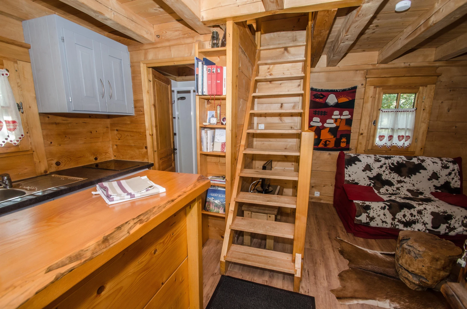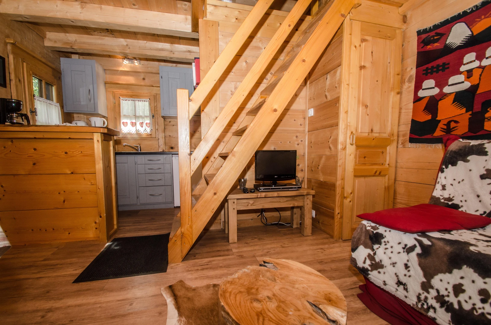 On the ground floor, you'll find a small equipped kitchen that opens onto a living room area with a TV and a wood stove perfect for cozy evenings.