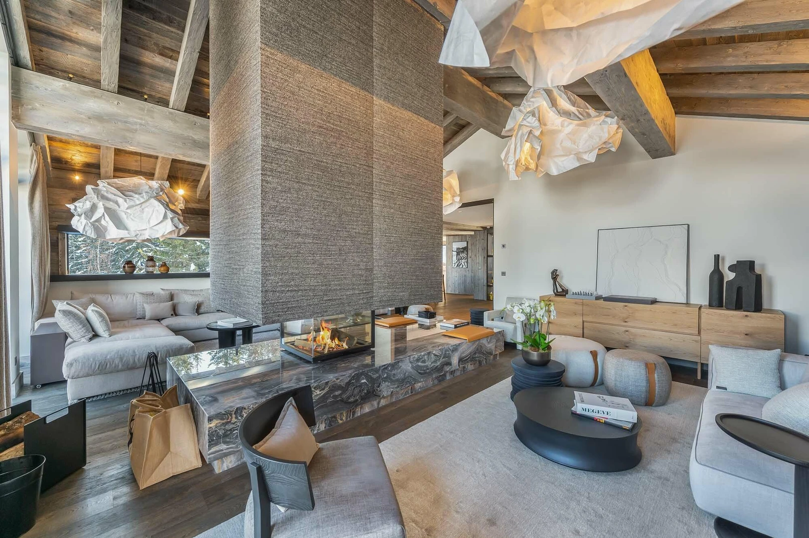 The chalet’s living areas, occupying an entire floor, are designed to inspire serenity. The vast lounge, warmed by an open fire, offers multiple spaces to unwind, while the modern, light-filled kitchen and dining room invite shared meals and moments. The decor harmoniously merges Alpine heritage with contemporary elegance, featuring weathered wood, soft wool accents, and furnishings with sleek lines and gentle curves. Even the ski room is thoughtfully crafted to provide a welcoming space for pre- or post-ski gatherings.