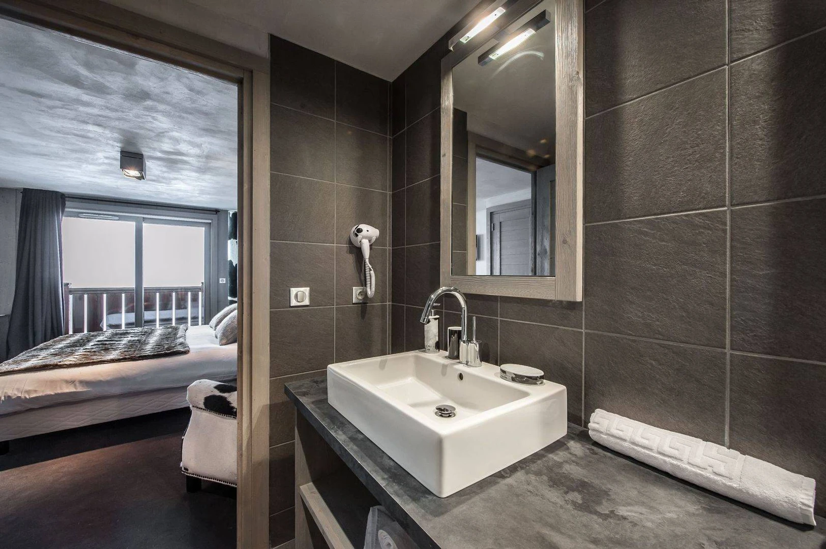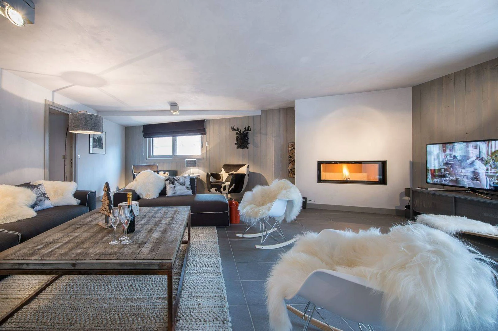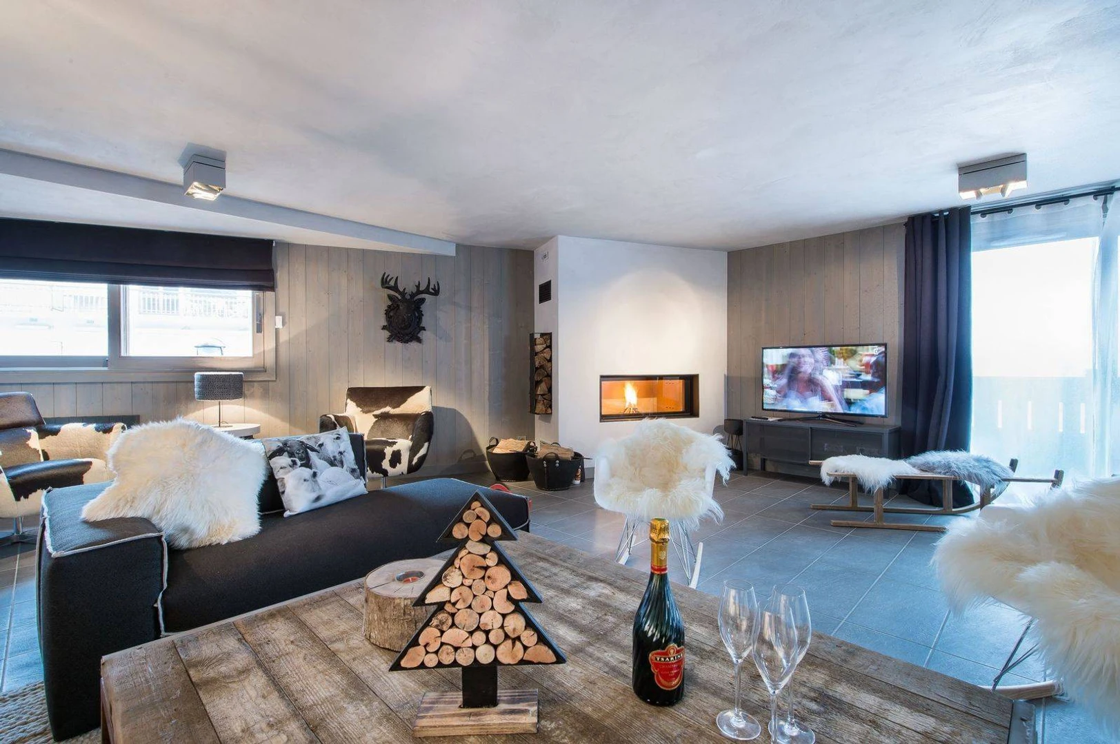 Blending modern design with traditional Savoyard charm, the interior features sleek lines and contemporary colors harmonized with classic alpine decor. The spacious living area includes a cozy lounge with a fireplace, a welcoming dining space, and a large open kitchen. Expansive windows reveal stunning views of the valley and resort.