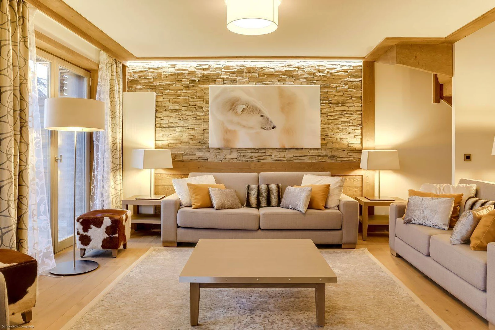 Inside, the apartment’s design reflects the warmth and elegance of the surrounding alpine nature. Light oak paneling and rough stone finishes create a cozy yet sophisticated atmosphere, while contemporary furniture and lighting complete the look. Every detail has been thoughtfully considered to create an environment of relaxed luxury.