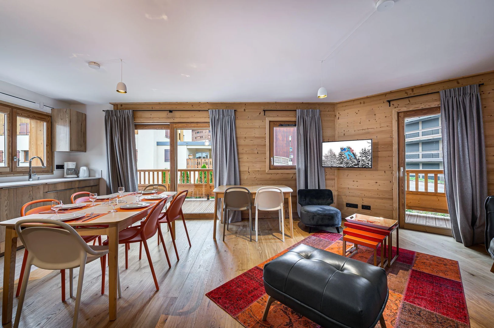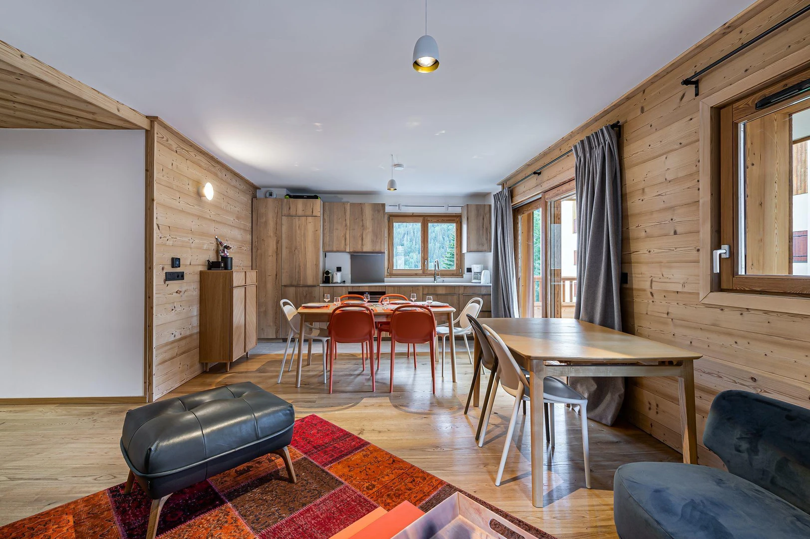 Chantemerle 102 is a modern apartment with a warm, family-friendly ambiance. Its bright living space features an open-plan kitchen, dining area, and lounge. The south-east-facing terrace offers stunning views of the Alpine peaks.