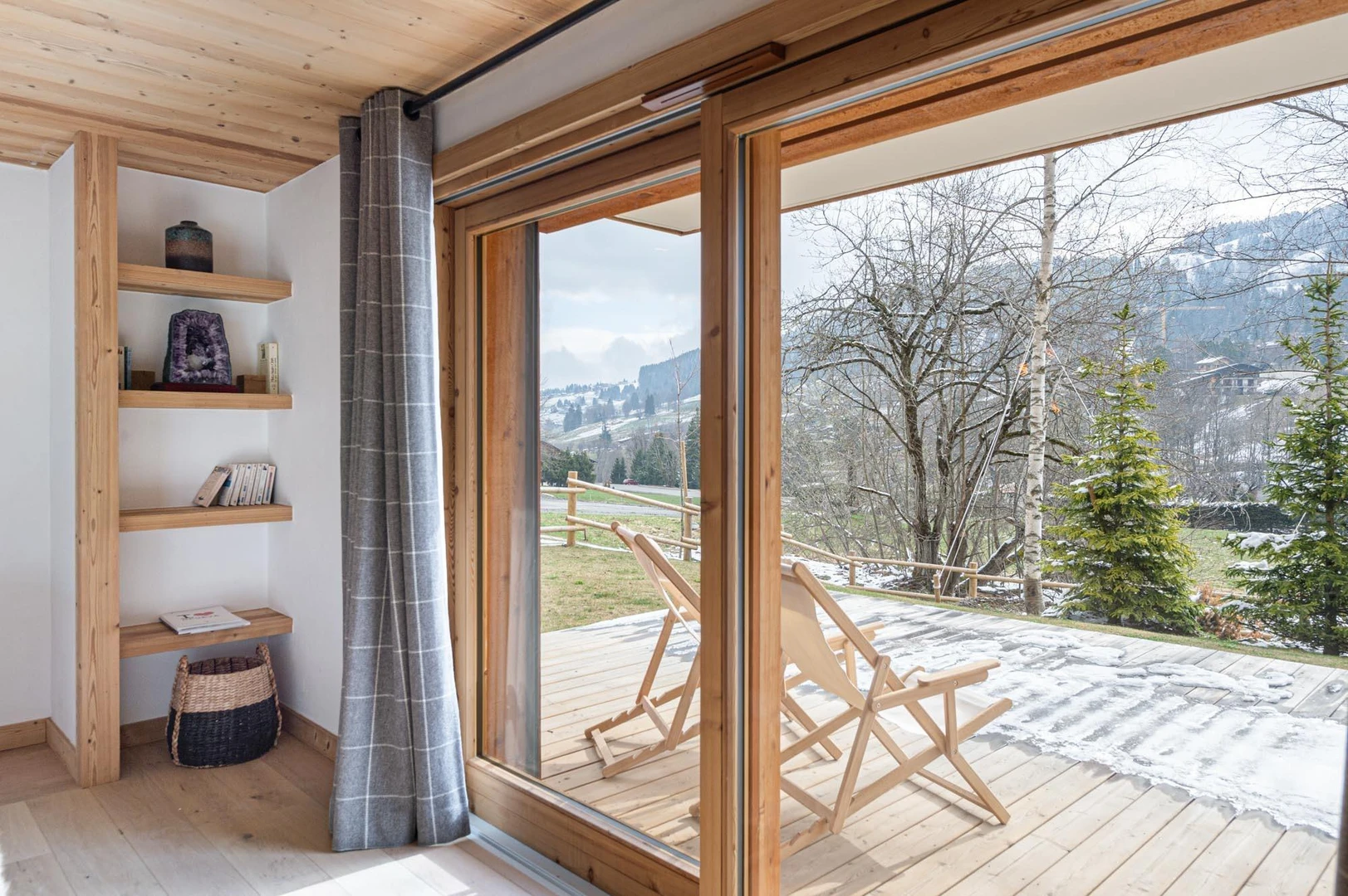 The spacious, open-plan living area is flooded with natural light from the large bay windows. Here, the living room with a cozy fireplace, the dining area, and the well-appointed kitchen blend seamlessly, framed by wood-clad walls and ceilings that evoke a warm chalet atmosphere. Step outside onto the expansive terrace to take in the unobstructed mountain views, the perfect backdrop for relaxing after a day on the slopes.