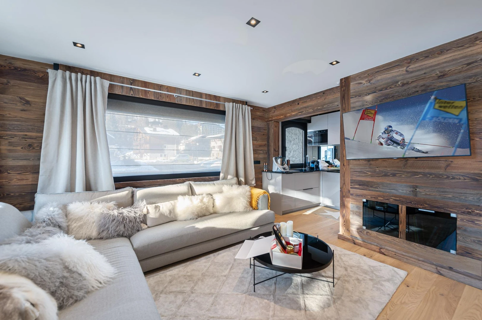 Blending chic modern design with timeless elegance, the apartment’s interior exudes warmth and comfort. Soft beige tones, contrasted with sleek black accents and plush materials, create a serene, cocooning ambiance. With its 80 sqm, the apartment comfortably accommodates up to 6 guests. It features a spacious entrance hall with ample storage and three thoughtfully arranged bedrooms: a double bedroom with a private shower room, another double bedroom, and a cozy bunk bedroom, complemented by a separate shower room. The bright and inviting living area is bathed in natural light, featuring a contemporary open-plan kitchen, dining area, and lounge. Large sliding doors lead to a sunny balcony, ideal for alfresco lunches while soaking up the alpine views. Additional conveniences include a cellar for ski equipment and a covered parking space.