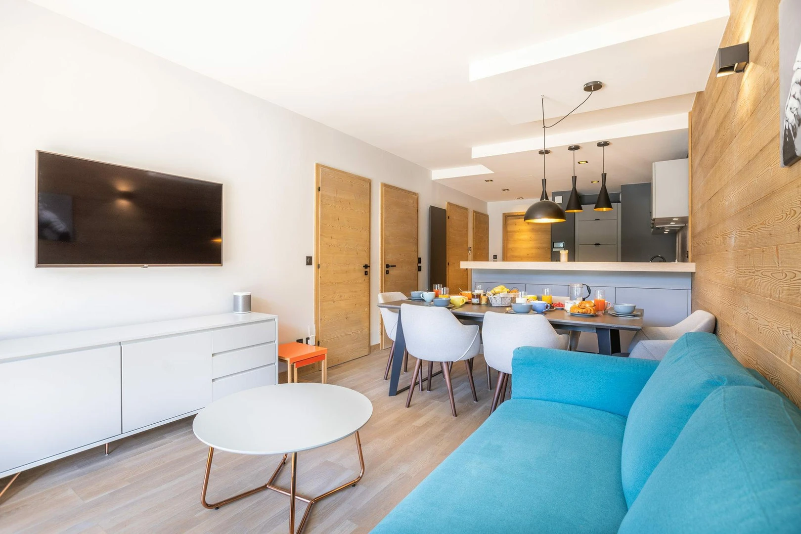 The apartment features a double bedroom with an additional single bed, a cabin room with bunk beds, and a welcoming living area with a modern kitchen that opens into a dining and lounge space. The highlight is its expansive 35 sqm south-facing terrace, offering uninterrupted views of Lac de Tignes and the surrounding mountains.