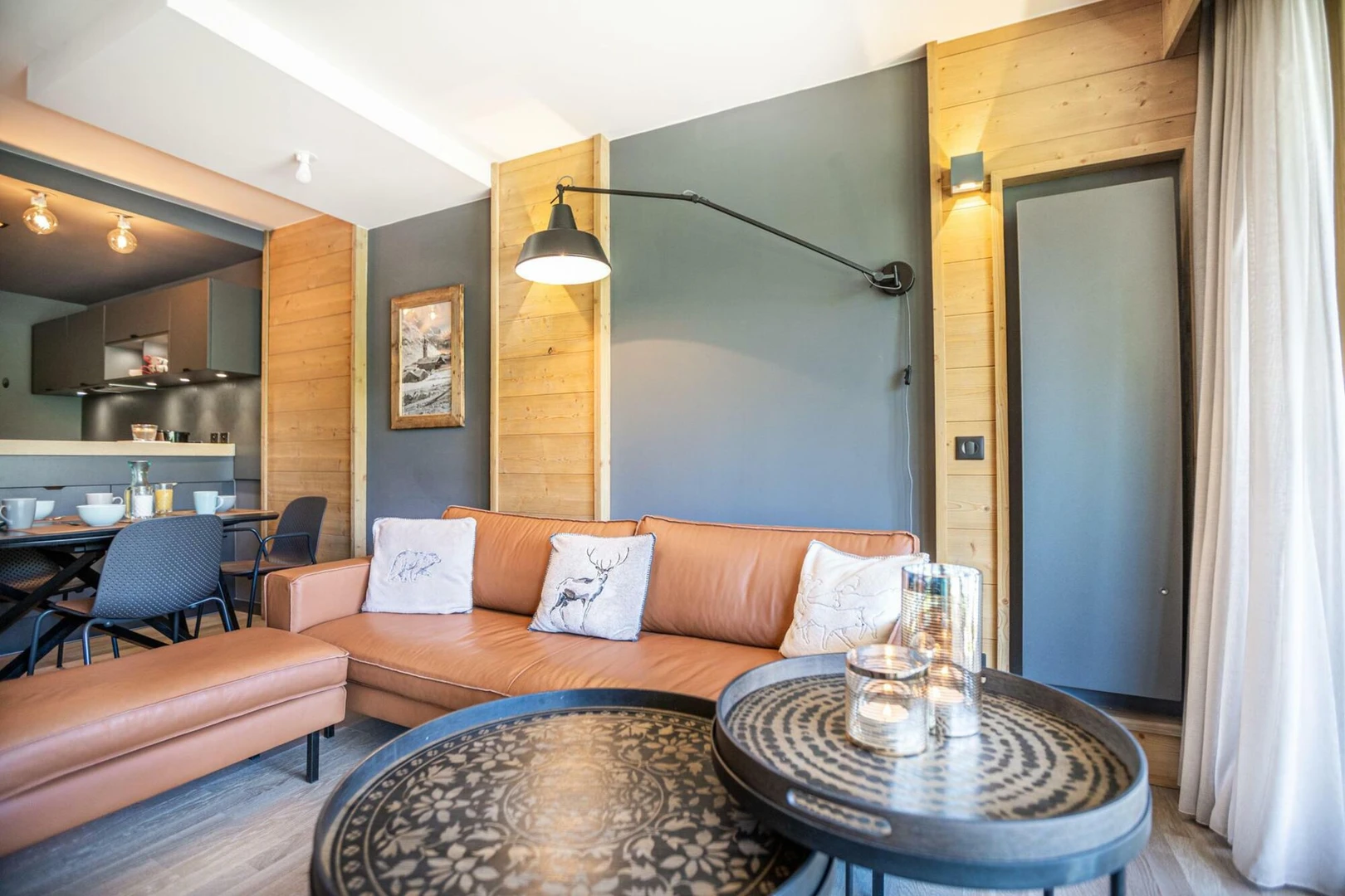 This 50 m² apartment comfortably accommodates up to 5 guests with a double bedroom and a cabin room featuring a bunk bed and a pull-out bed. The open-plan living space includes a modern kitchen, a dining area, and a lounge that opens onto a south-facing balcony with breathtaking panoramic views of Lake Tignes and the surrounding Tovière and Grande Motte peaks.