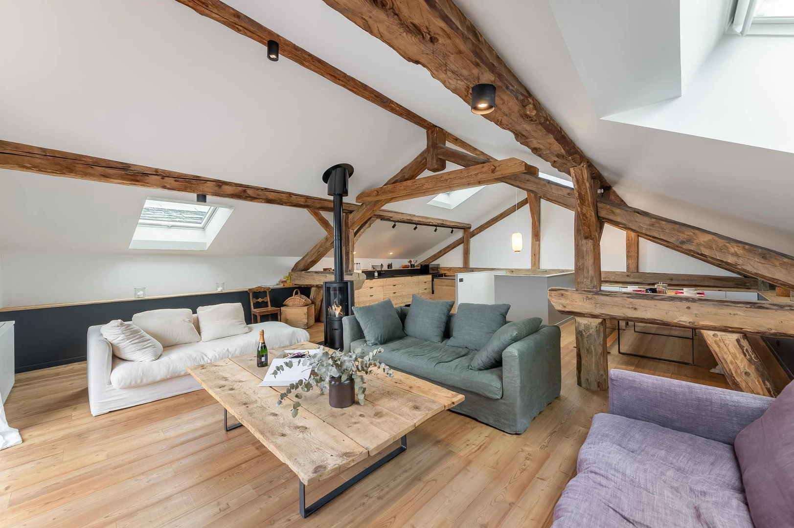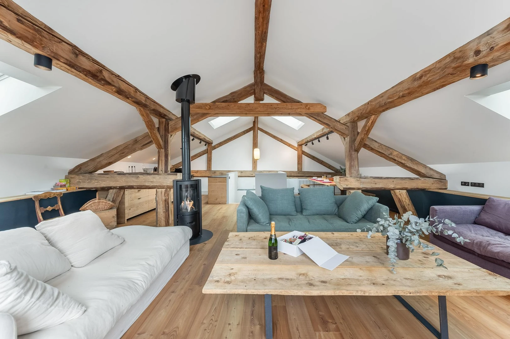 Spanning 190 m², the chalet accommodates up to 12 guests with 3 en-suite bedrooms and a dormitory with 6 beds. The top-floor attic living area features an open kitchen, dining space, and a cozy living room with a stove, all opening onto a terrace with stunning village and mountain views.