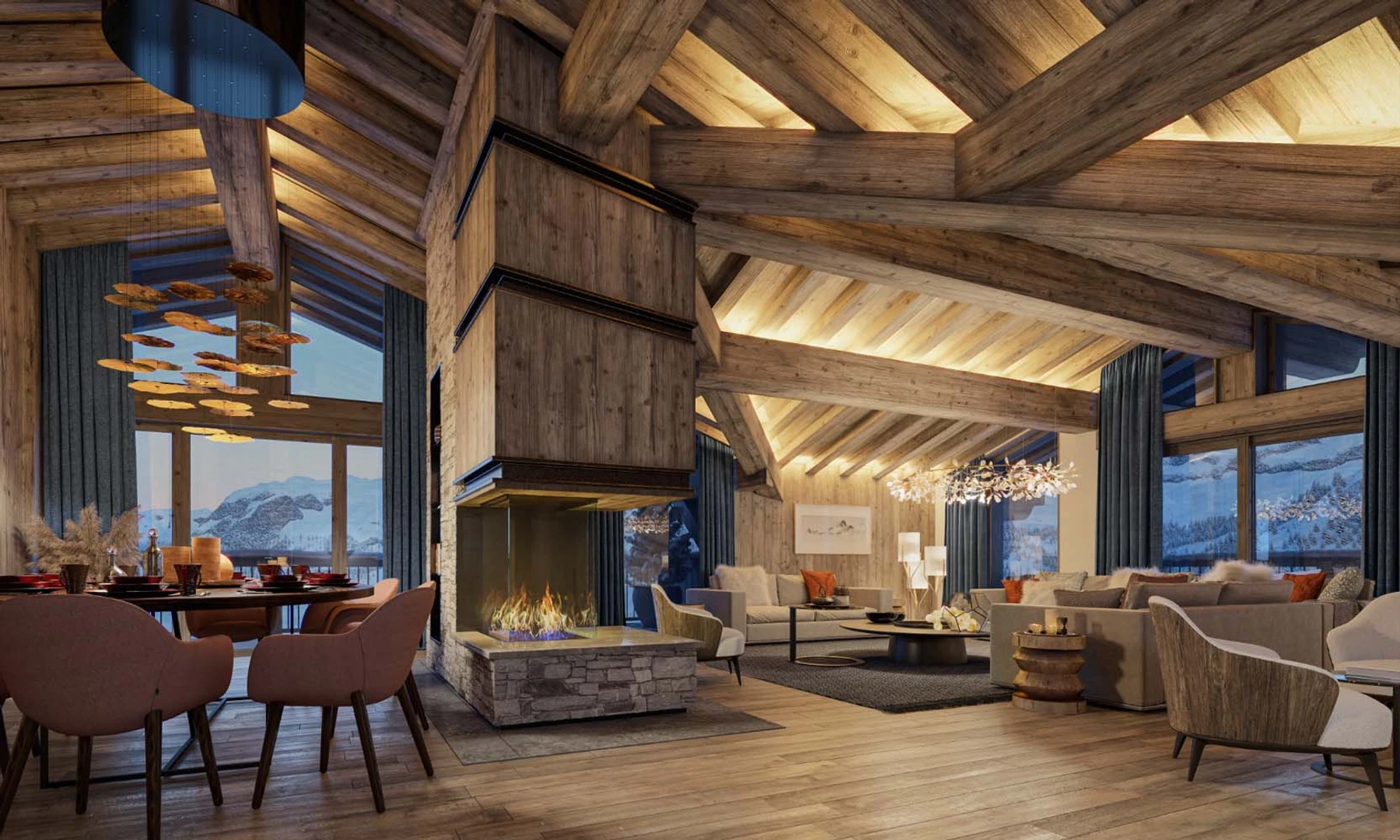 Inside, the chalet exudes warmth and tradition, with its rustic wood finishes and carefully selected furnishings that reflect the authentic mountain lifestyle. Folk art and vintage decor pieces add character and history to the space, while an expansive open fireplace brings a cozy and inviting atmosphere to the living area. Guests can relax in this glamourous spot, while enjoying the stunning views of Saulire.